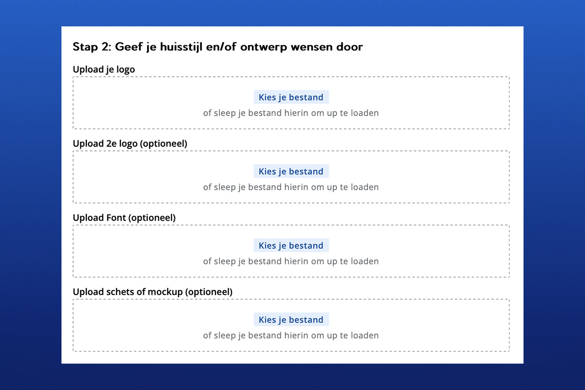 Bevor wir eine digitale Präsentation für Sie erstellen können, benötigen wir einige Dateien. Dazu gehören Ihr Logo, eine Schriftart (auch als Font bezeichnet) und eine Skizze und/oder Mock-up. Während des Bestellprozesses gelangen Sie automatisch zu dem Tool, in dem Sie Ihre Dateien hochladen können.